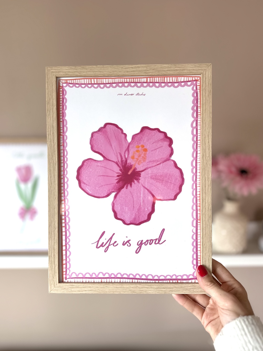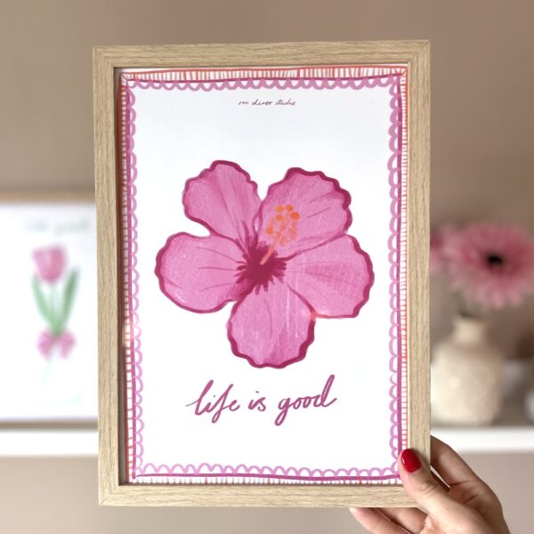 • Illustration : Hibiscus rose et message « Life is good » – dessinée à la main