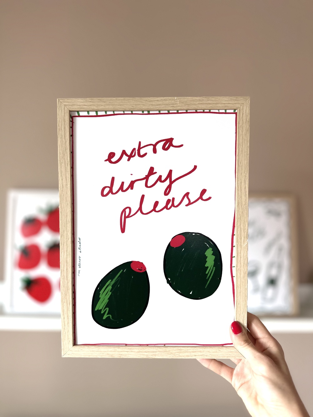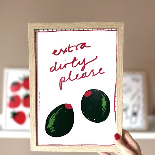 Ajoutez une touche de provocation élégante et de fantaisie méditerranéenne à votre décoration avec l’affiche “Olives & co”. Cette illustration minimaliste met en scène une olive verte stylisée, légendée d’un audacieux “extra dirty please”, clin d’œil amusé aux amateurs de Martini sec… mais pas trop. Avec sa palette de verts olive et de rouge profond, cette affiche graphique et punchy évoque autant le charme des apéros italiens que l’ironie subtile des cafés arty de Brooklyn.