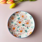 Faites éclore vos moments de convivialité avec l’assiette « Flora Rose ». Peinte à la main au Portugal, chaque pièce est unique, ornée de fleurs rose tendre et ponctuée d’un liseré bleu ciel tout en délicatesse.