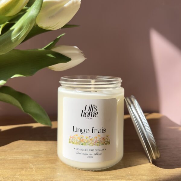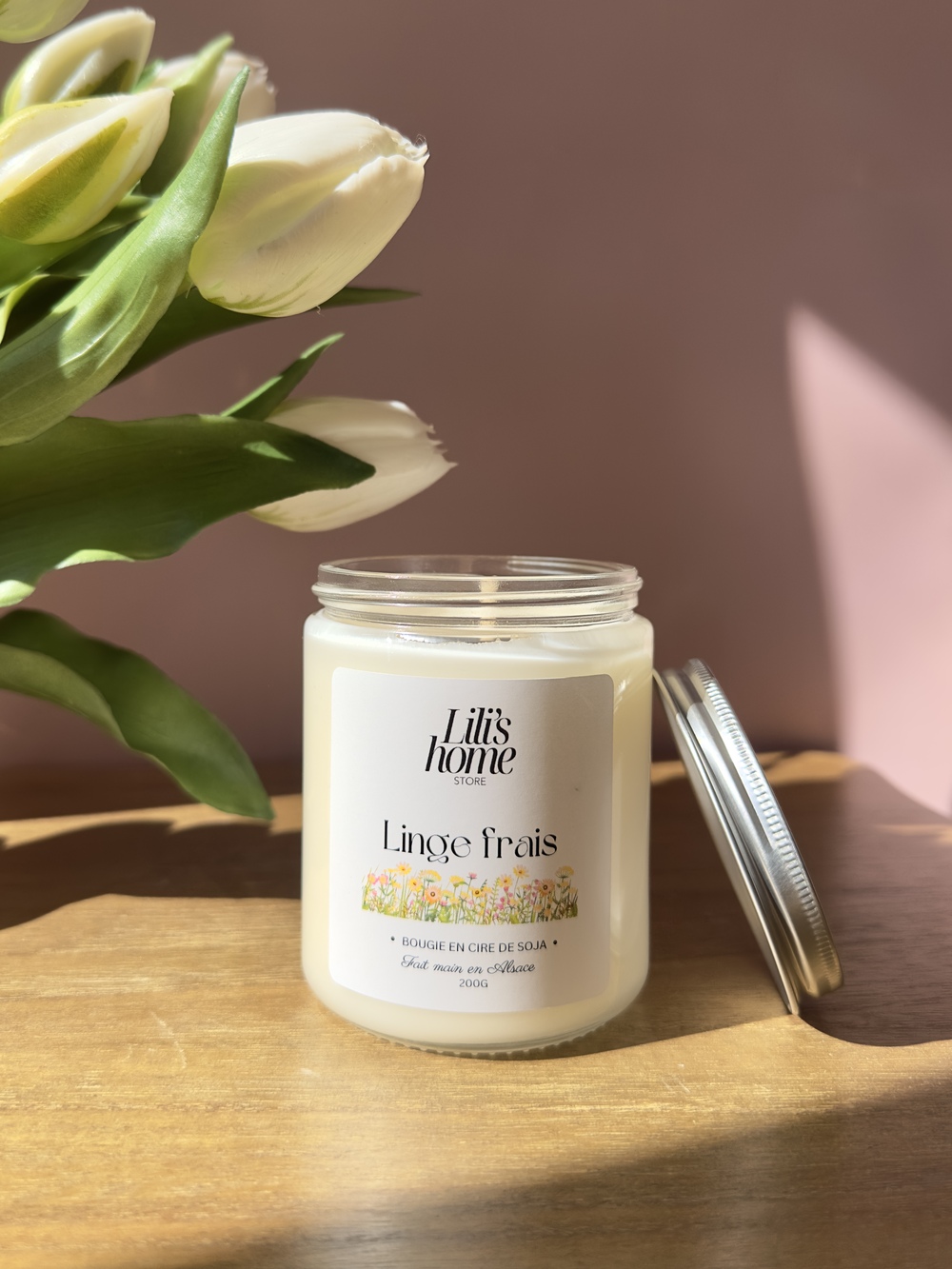 Retrouvez la sensation incomparable du linge tout juste propre avec Linge Frais, une bougie artisanale coulée à la main à base de cire de soja 100 % naturelle