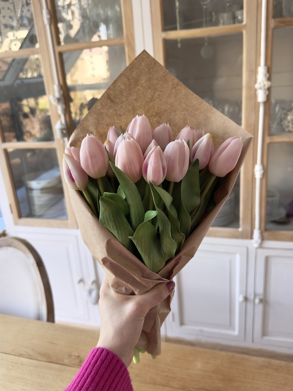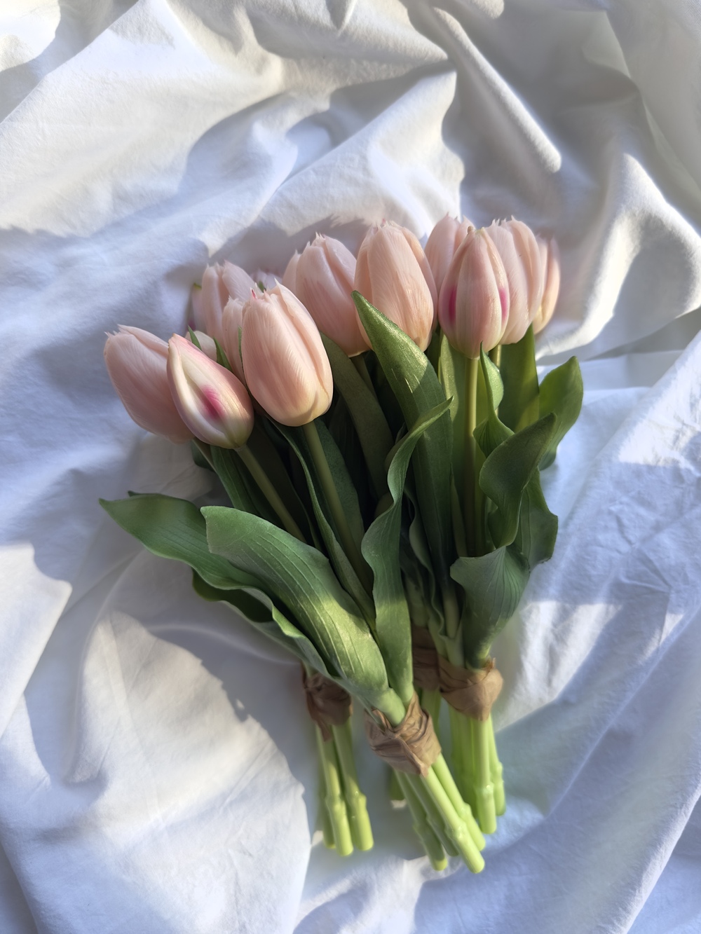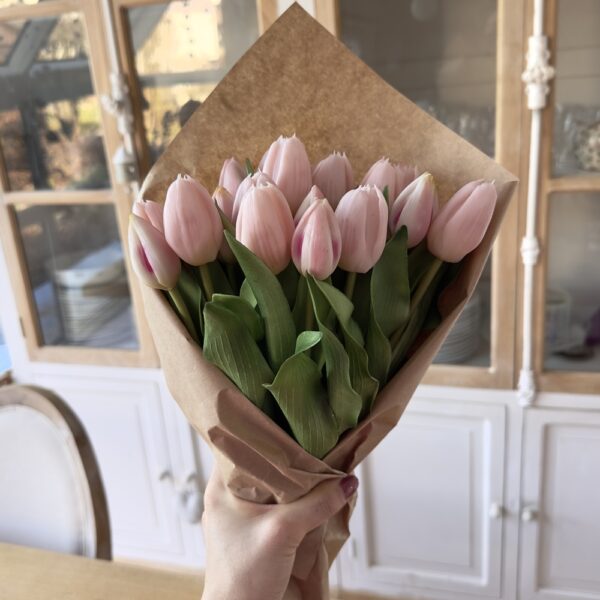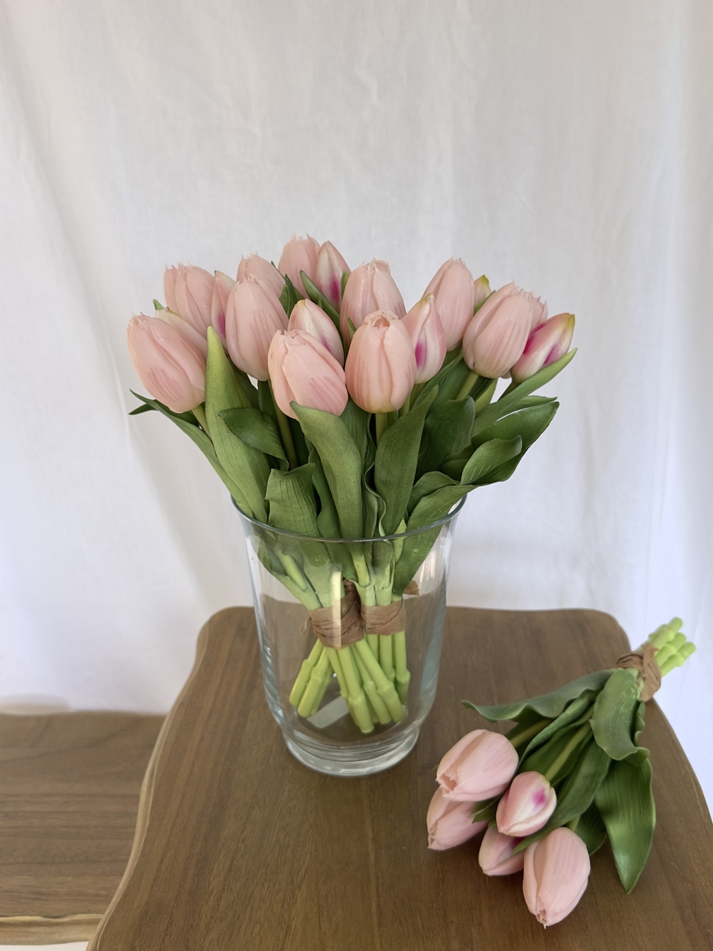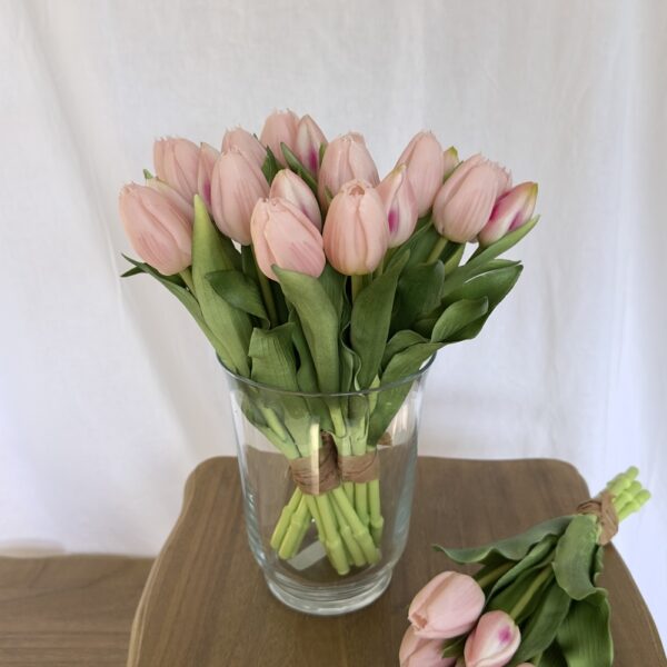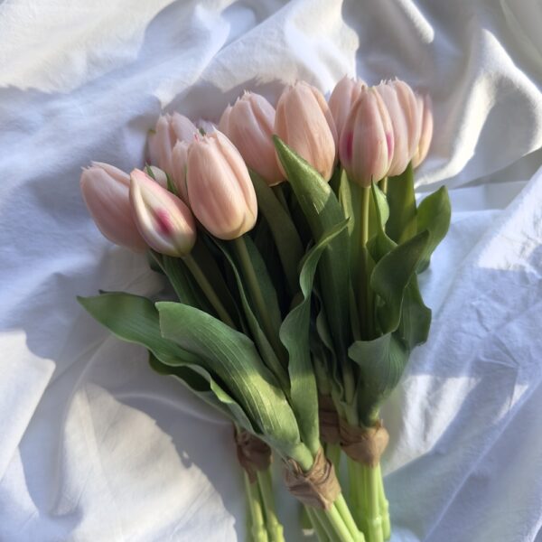 Les pétales présentent de subtiles nuances de rose pour imiter parfaitement la profondeur et la délicatesse des tulipes naturelles. Les feuilles souples et finement travaillées renforcent l’effet naturel, offrant un visuel bluffant de réalisme.