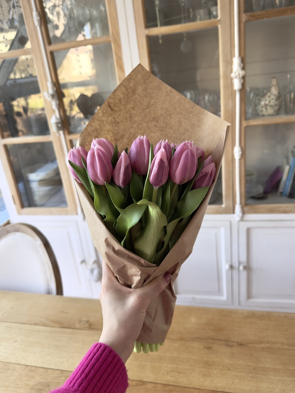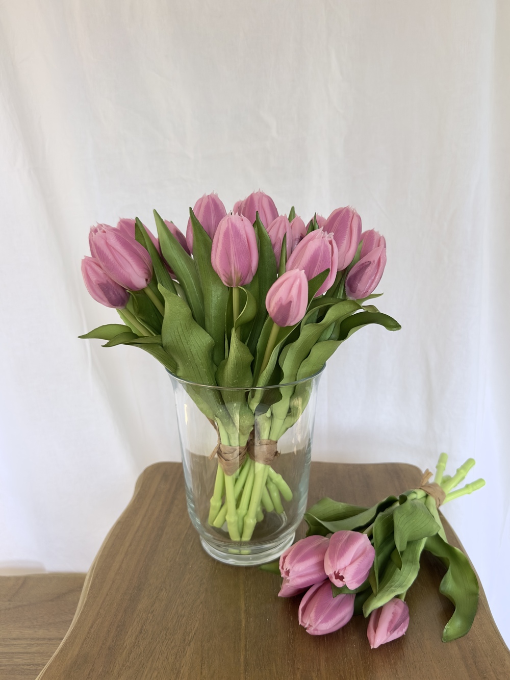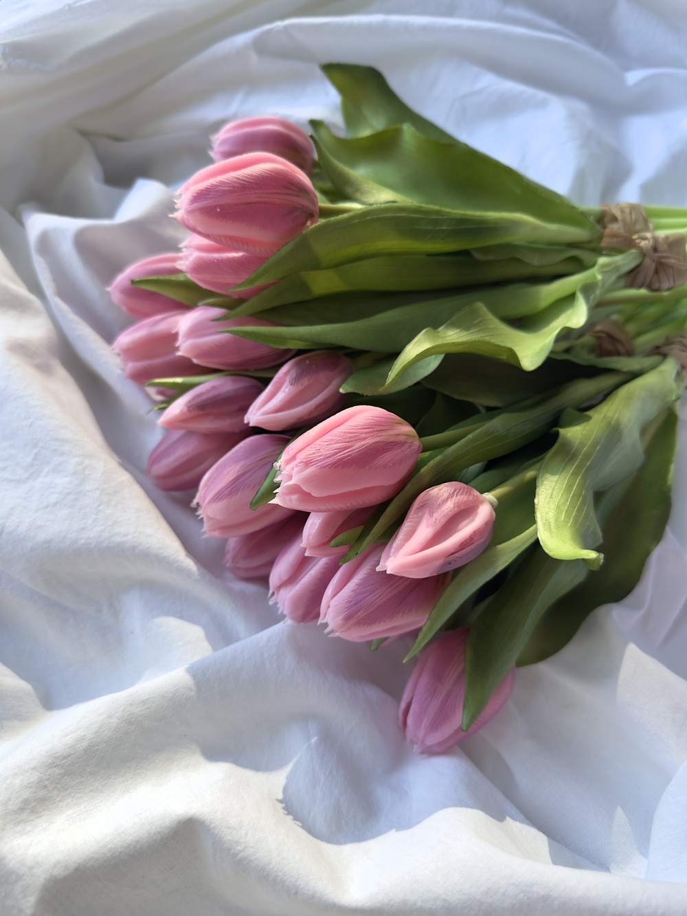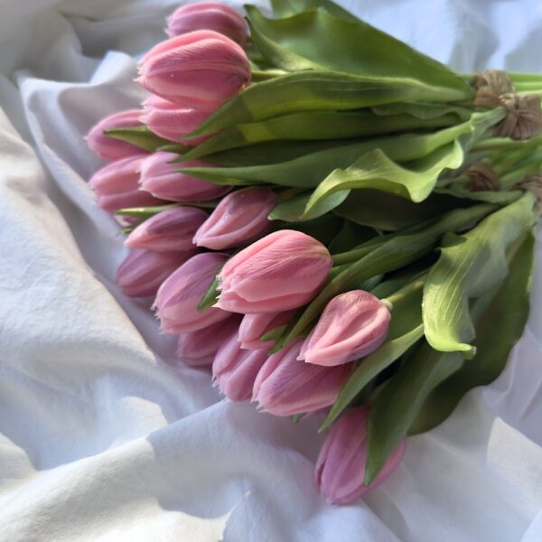 Les pétales présentent de délicates variations de teintes rosées, apportant profondeur et naturel à chaque fleur. Les feuilles souples et finement travaillées accentuent l’effet authentique pour un bouquet décoratif haut de gamme, visuellement proche de tulipes fraîches.
