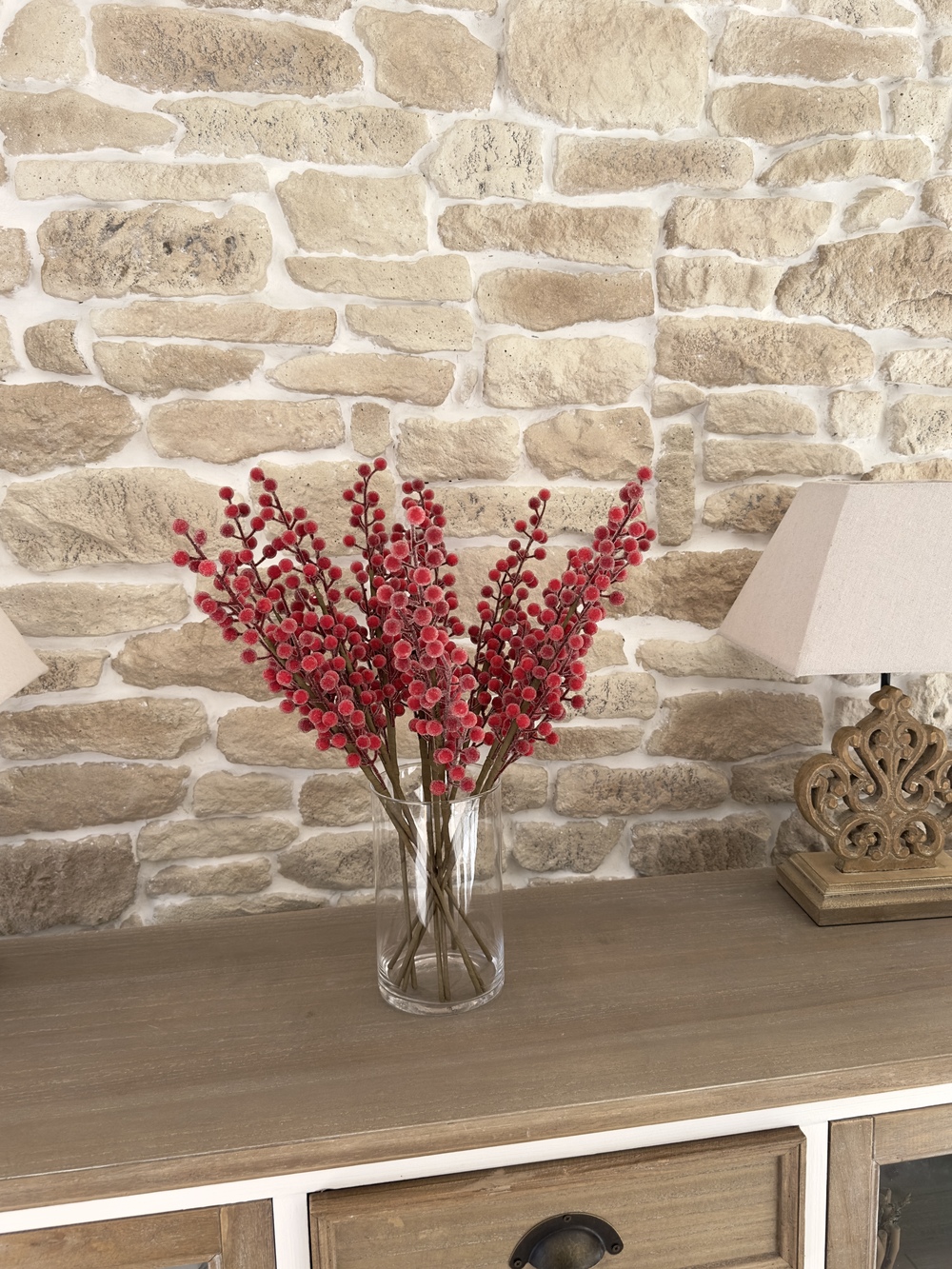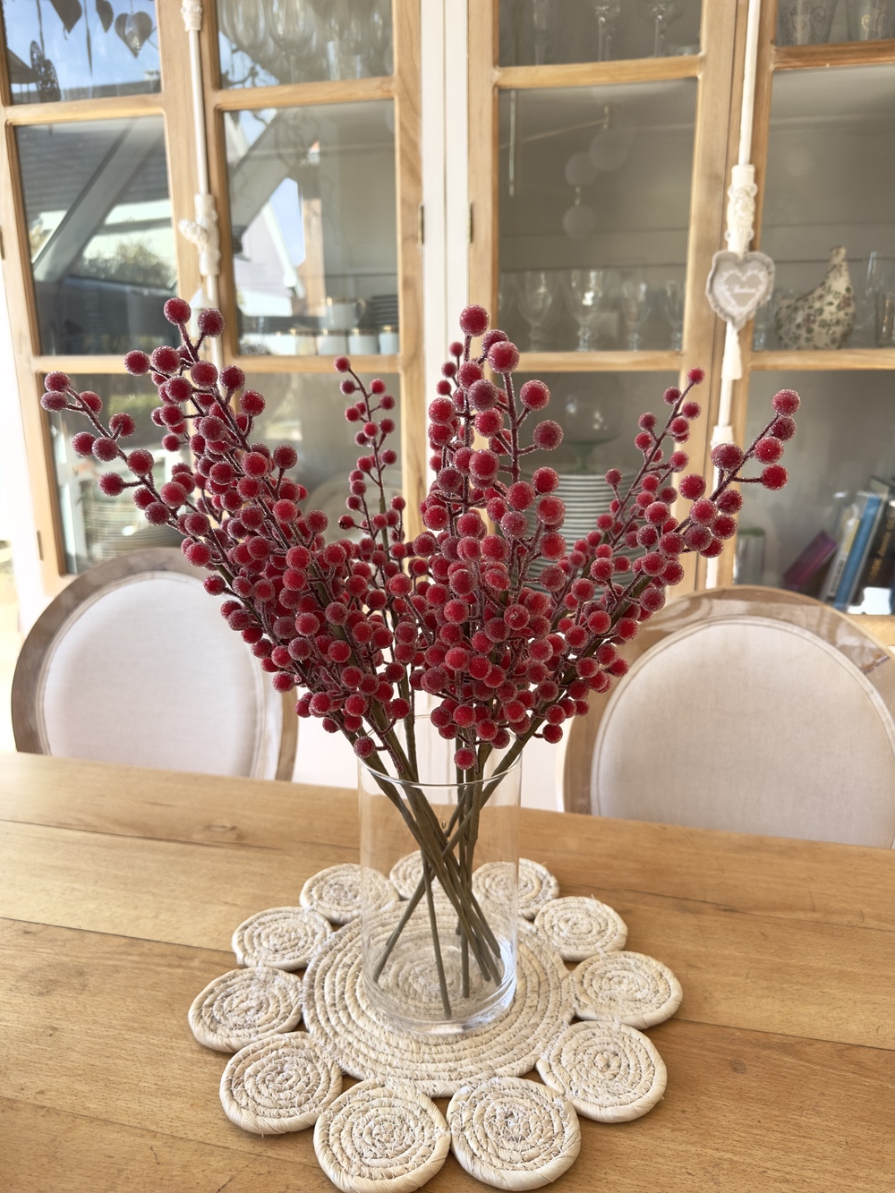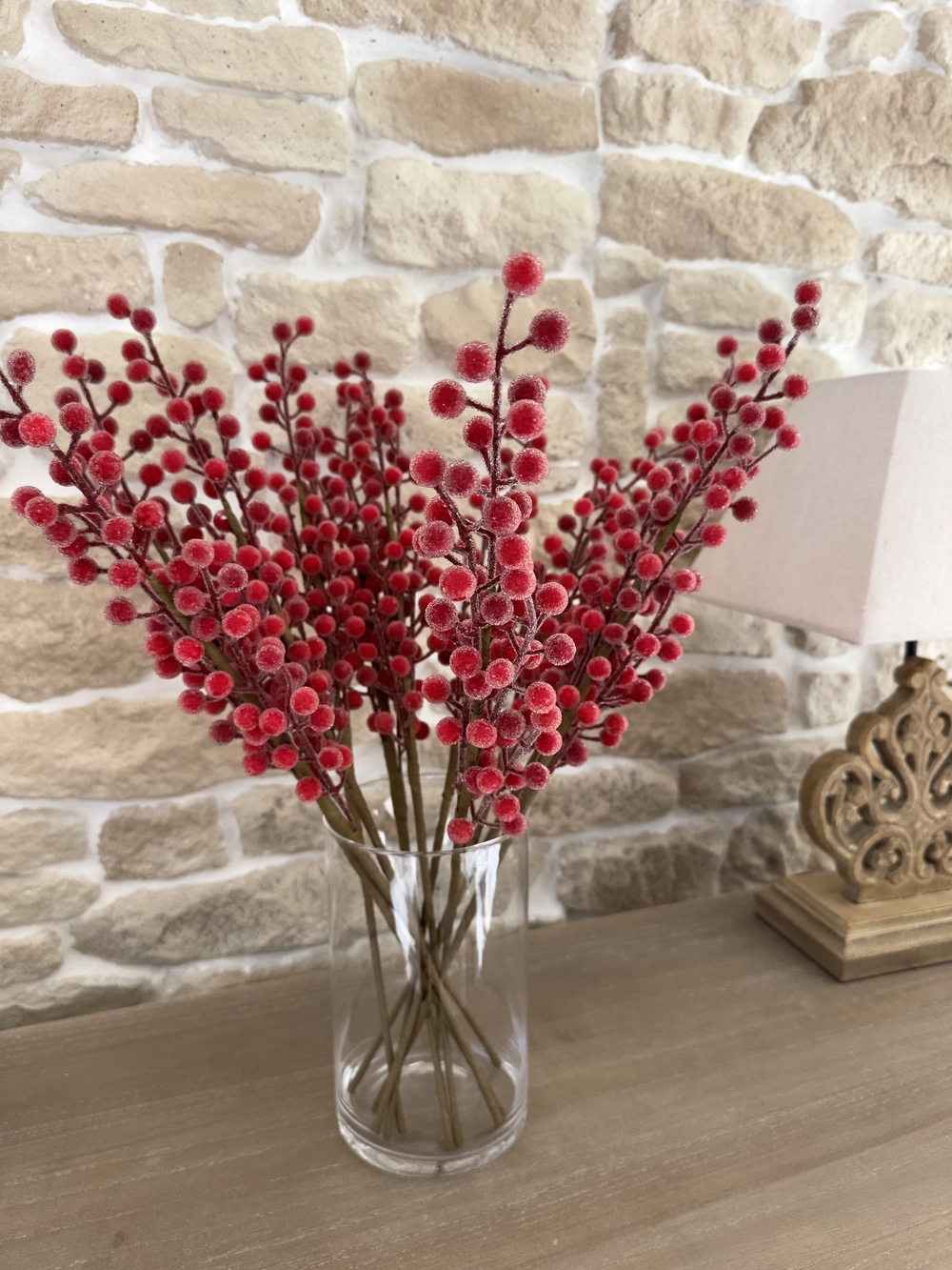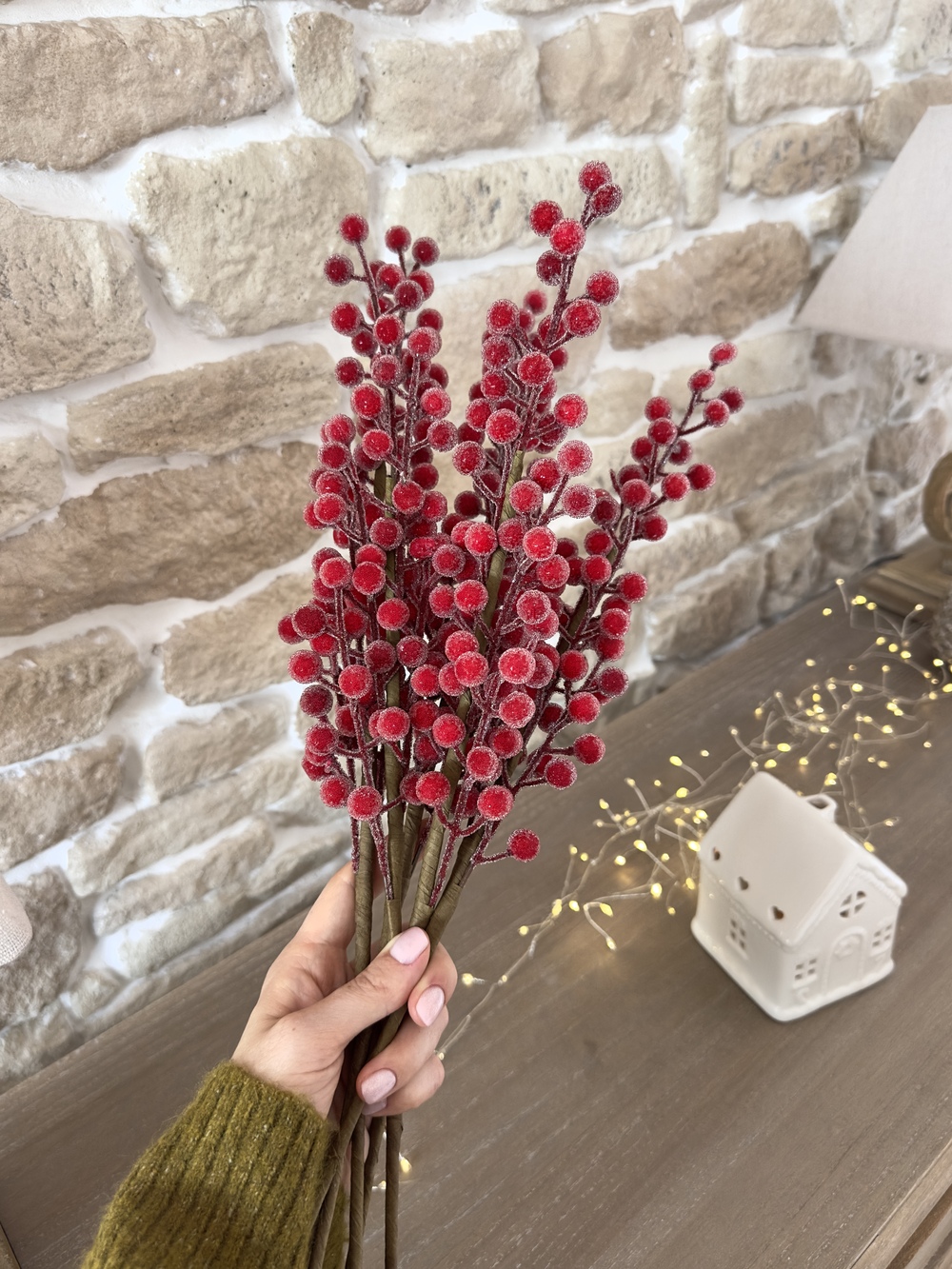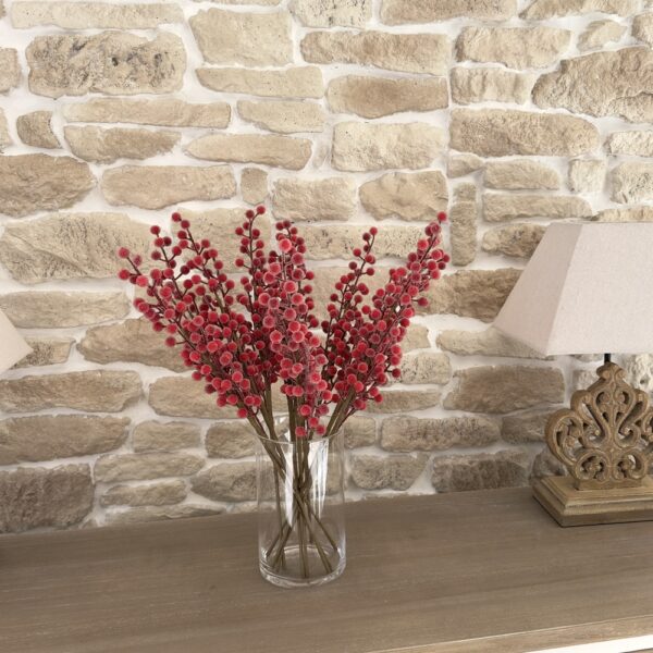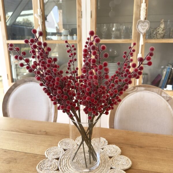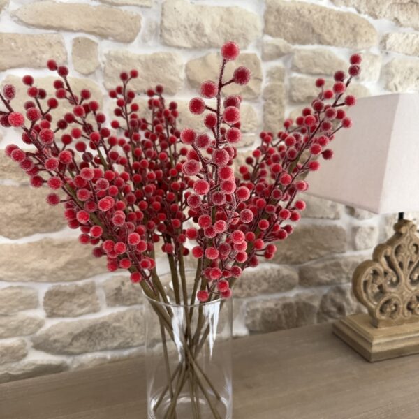 Chaque tige mesure 50 cm et se compose de baies rouges réalistes, délicatement recouvertes d’un léger effet givré pour un rendu glacé, chic et lumineux.