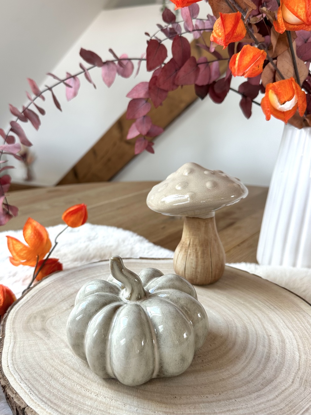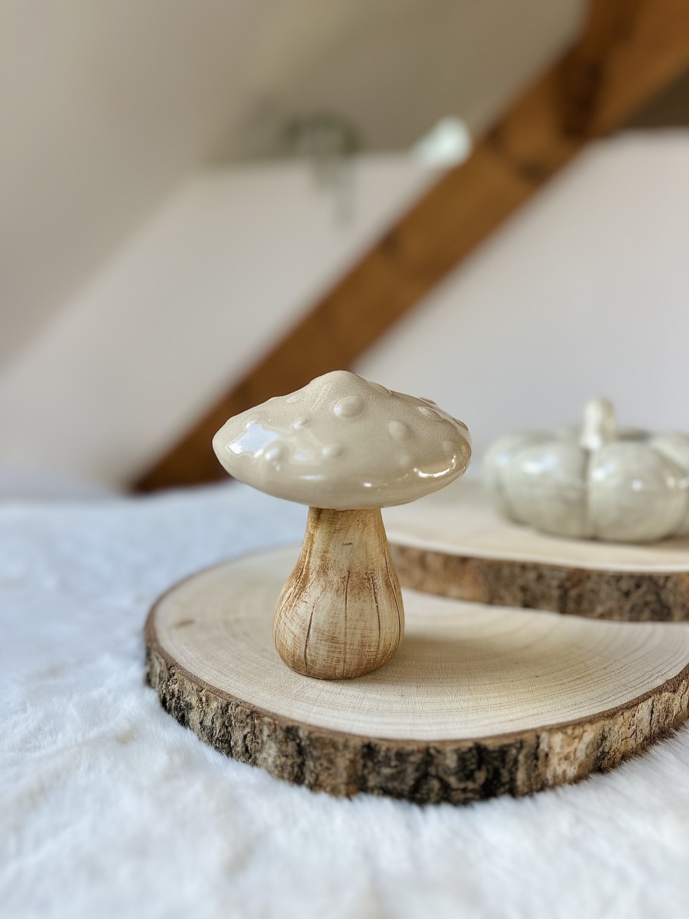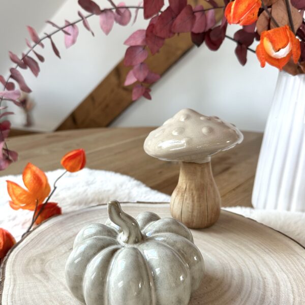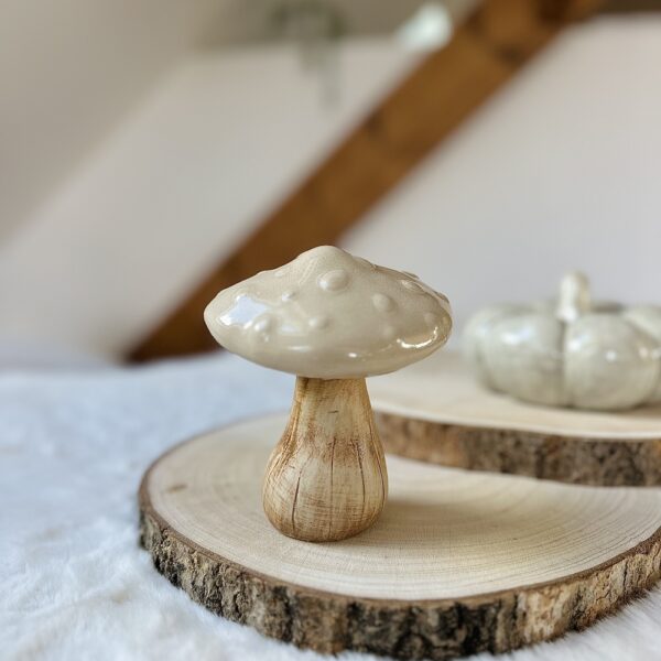 Ajoutez une note naturelle et tendance à votre décoration automnale avec ce champignon en céramique beige. Son design raffiné, avec son pied effet bois et son chapeau lisse et brillant, évoque à la fois la douceur de l’automne et la poésie de la forêt.