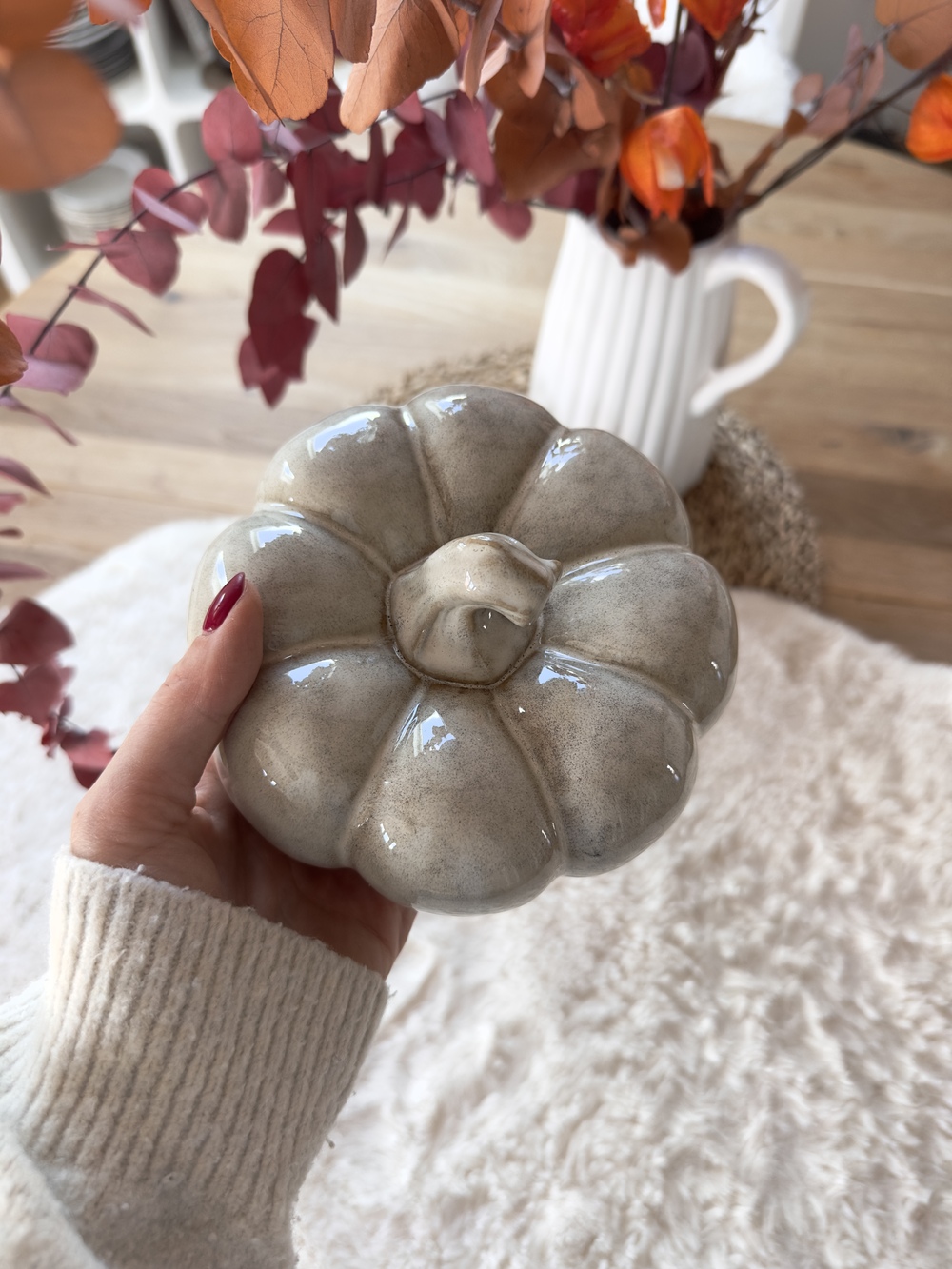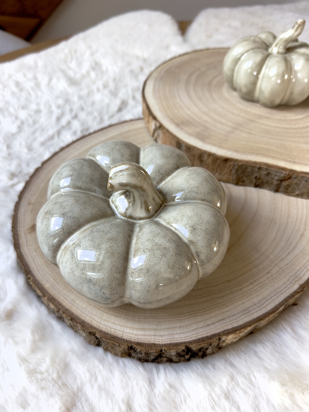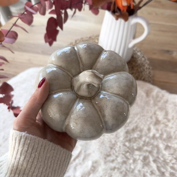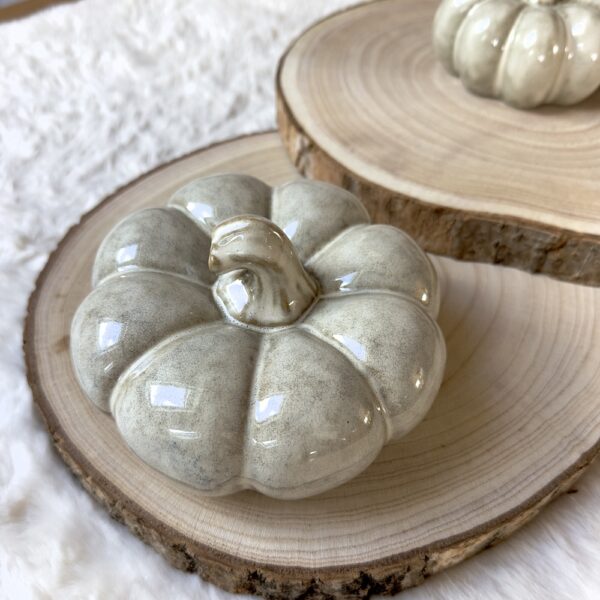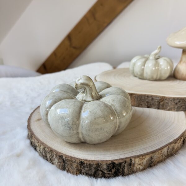 Complétez votre décoration automnale avec notre citrouille en céramique mottlée beige – format moyen. Plus imposante que la version petite, elle conserve le même charme élégant avec son effet moucheté unique et sa finition brillante.