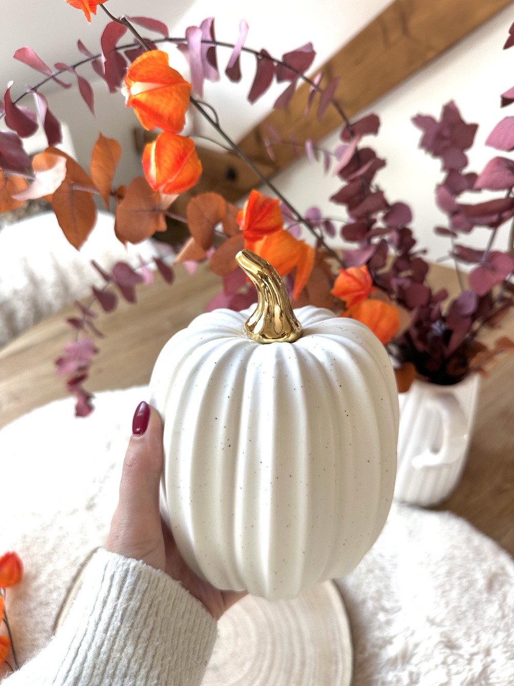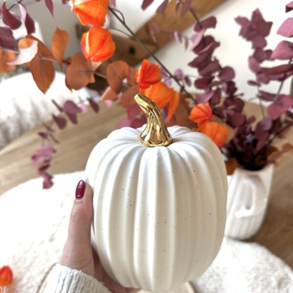 Apportez une touche chic et raffinée à votre décoration d’automne et d’Halloween avec notre citrouille en céramique blanche. Son design minimaliste et moderne, associé à une queue dorée éclatante, en fait un véritable objet de décoration tendance qui s’intègre parfaitement dans tous les styles d’intérieurs : du bohème au contemporain.