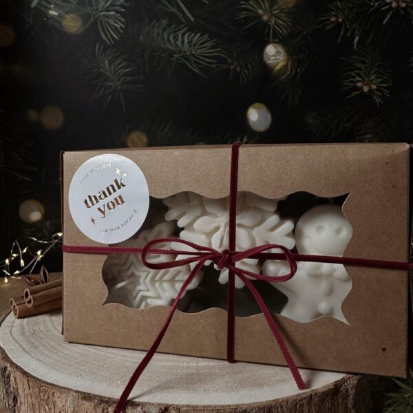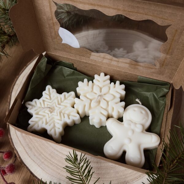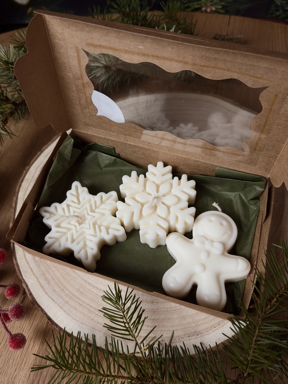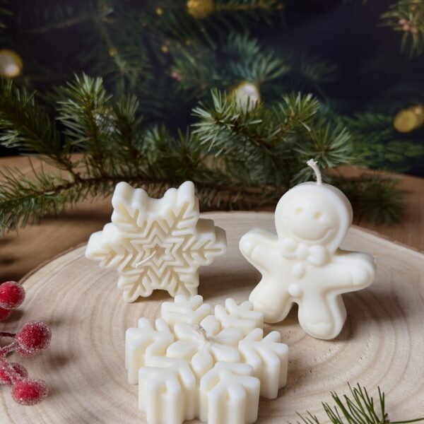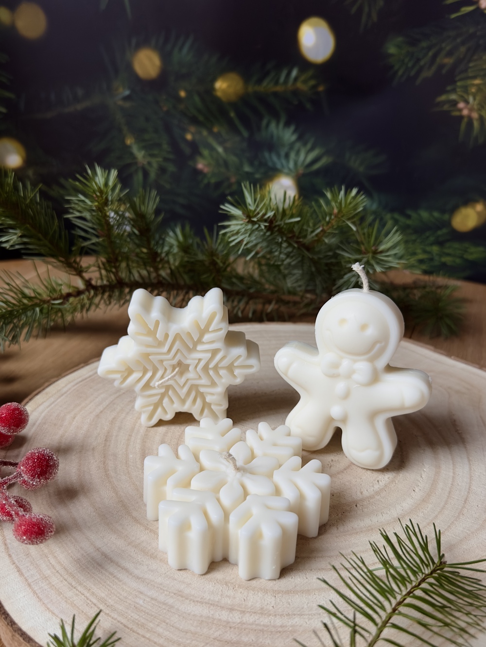 Fabriquées avec amour à la main, ces trois bougies en cire de soja naturelle se déclinent en deux flocons de neige délicats et un bonhomme pain d’épices adorable, aux détails soignés et à la finition blanche laiteuse.