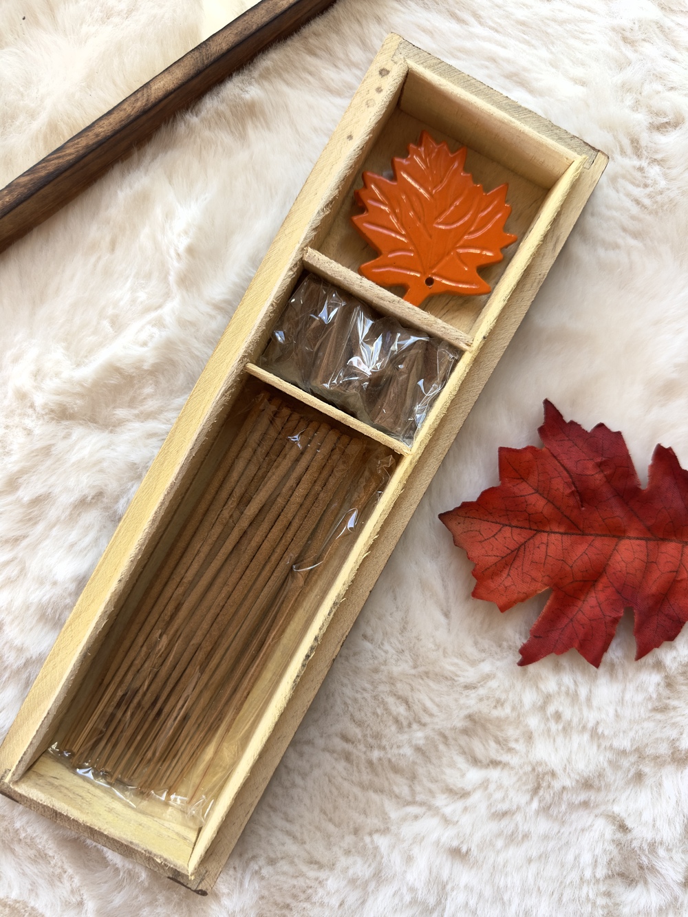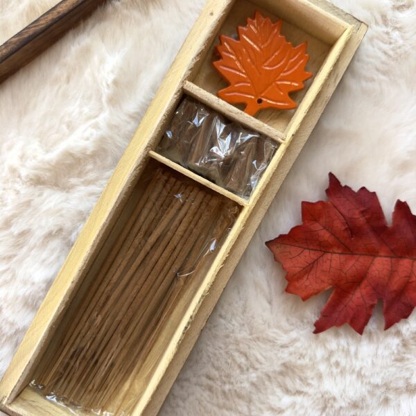 Le coffret comprend des cônes d’encens parfumés, des bâtonnets d’encens ainsi qu’un porte-encens en céramique en forme de feuille, le tout présenté dans une élégante boîte en bois réutilisable.
