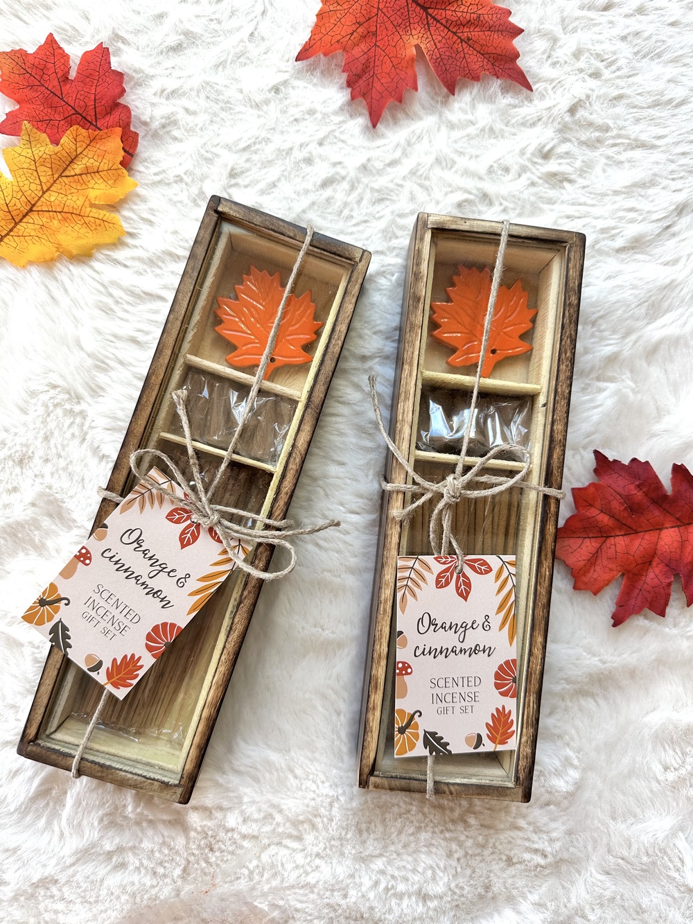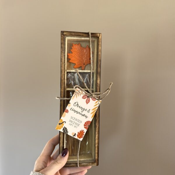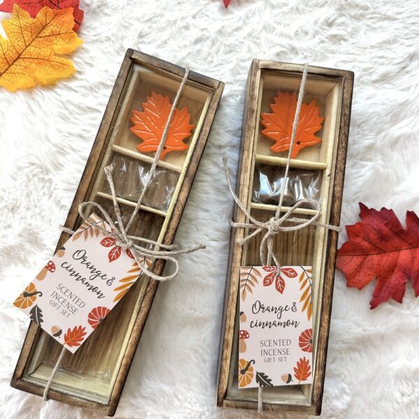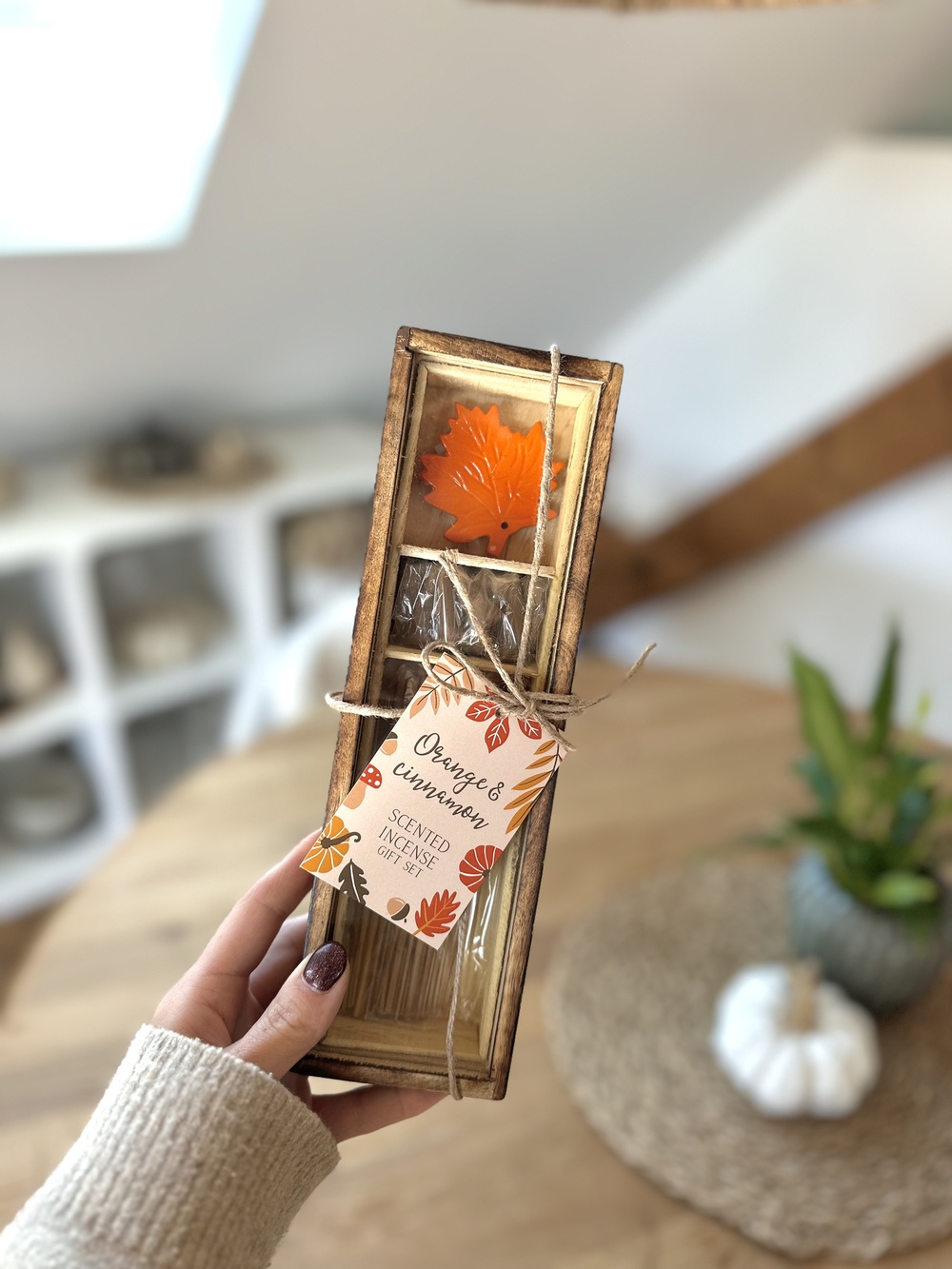 Offrez ou offrez-vous un moment de douceur parfumée avec ce coffret d’encens automnal aux senteurs d’orange et de cannelle. Idéal pour instaurer une ambiance chaleureuse et réconfortante, ce kit contient tout le nécessaire pour parfumer délicatement la maison sans allumettes ni effort.