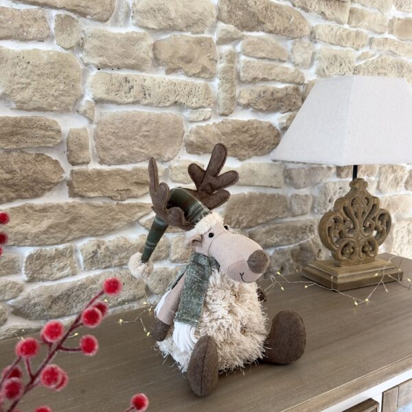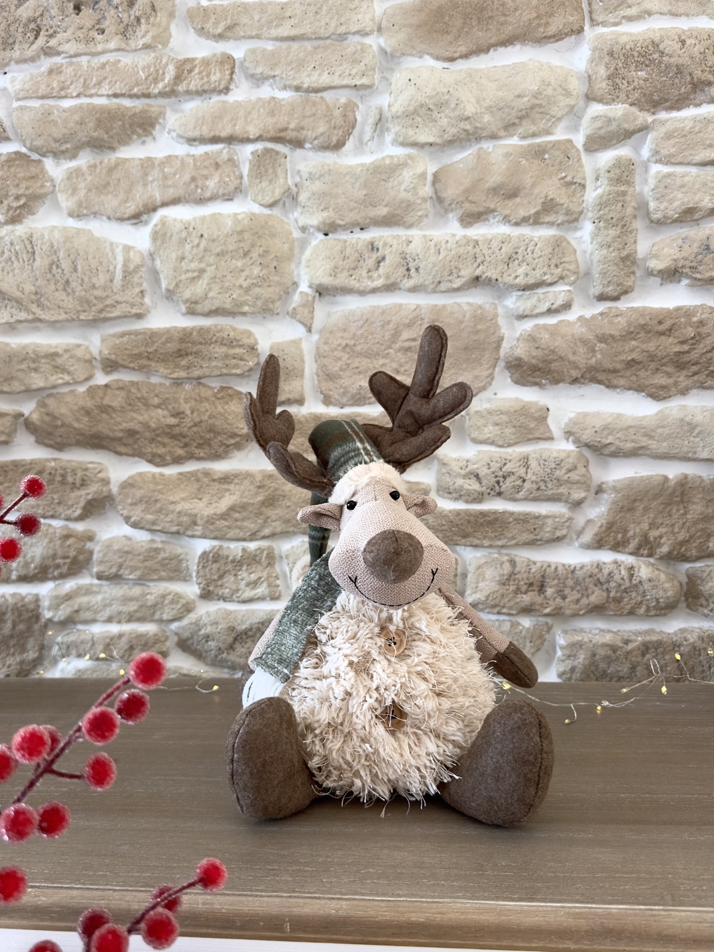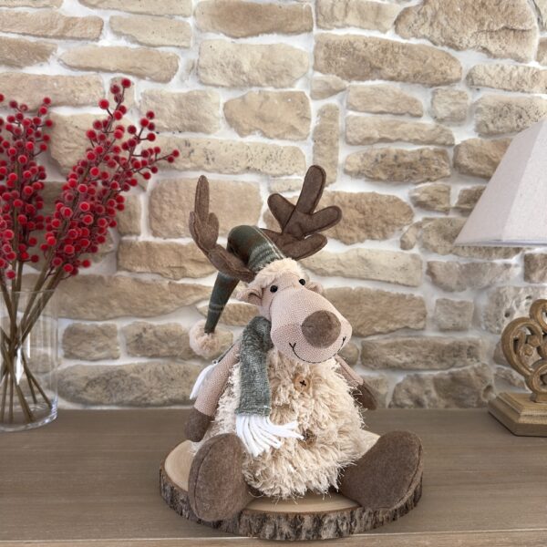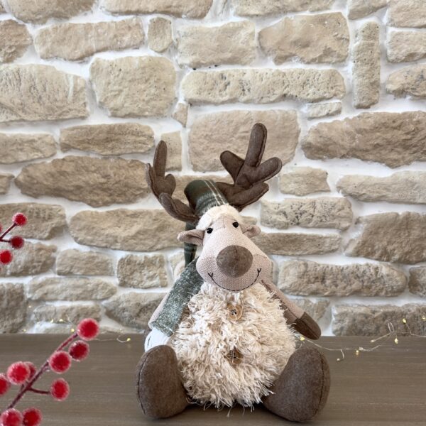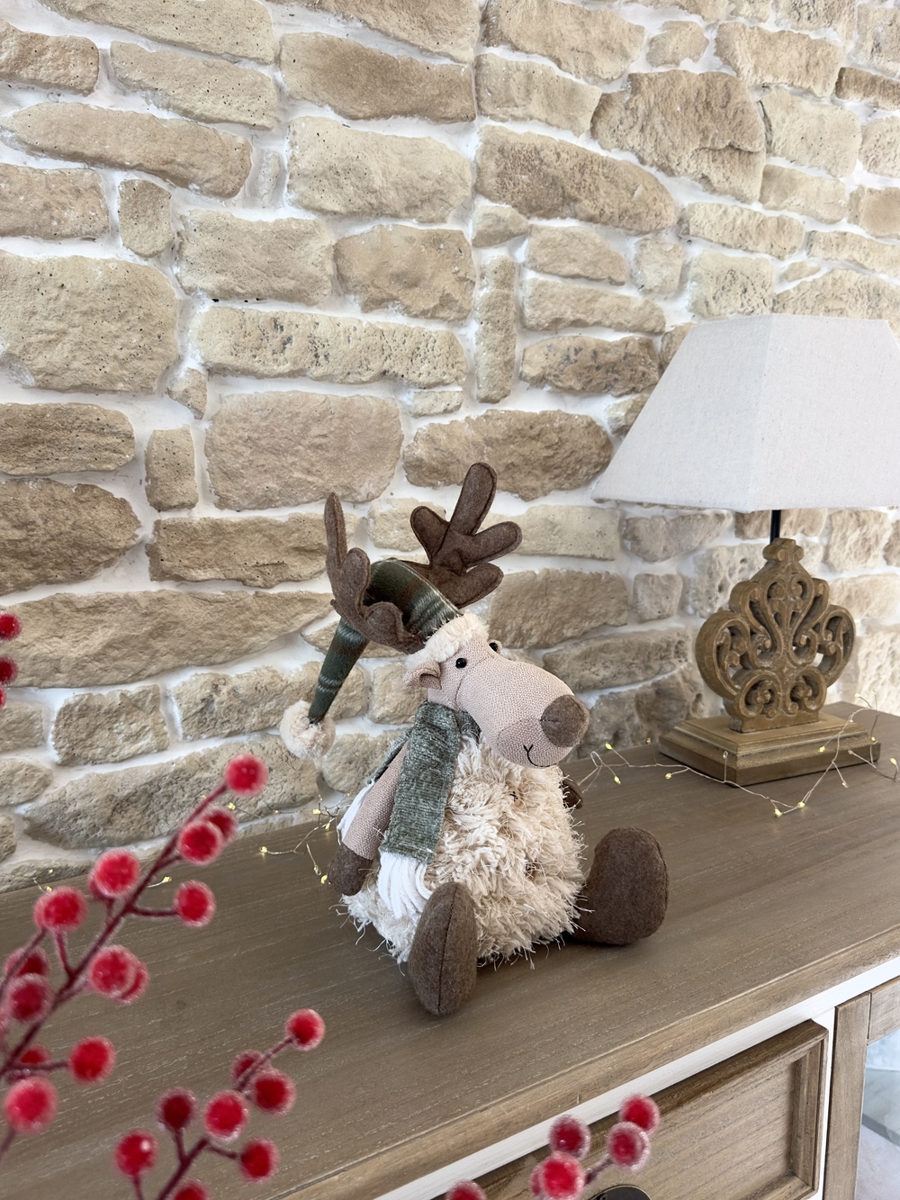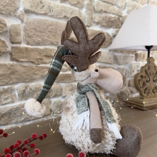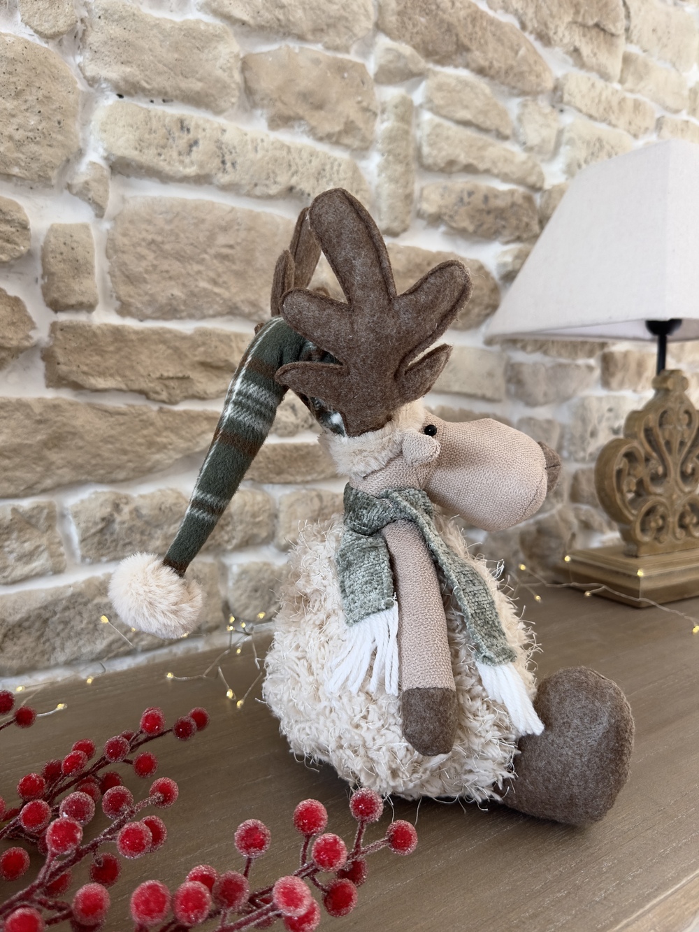 Apportez une touche de douceur nordique à votre décoration de Noël avec Rodolphe des Bois, un adorable renne assis au style naturel et chaleureux. Avec son corps moelleux façon laine, ses bois et sabots bruns, et son bonnet tartan vert assorti à une petite écharpe douillette, il incarne l’esprit cocooning des fêtes.