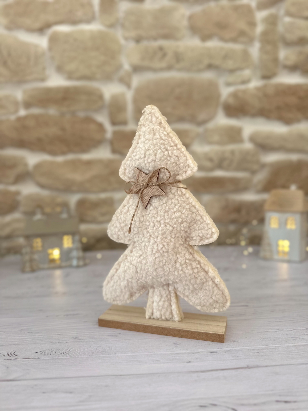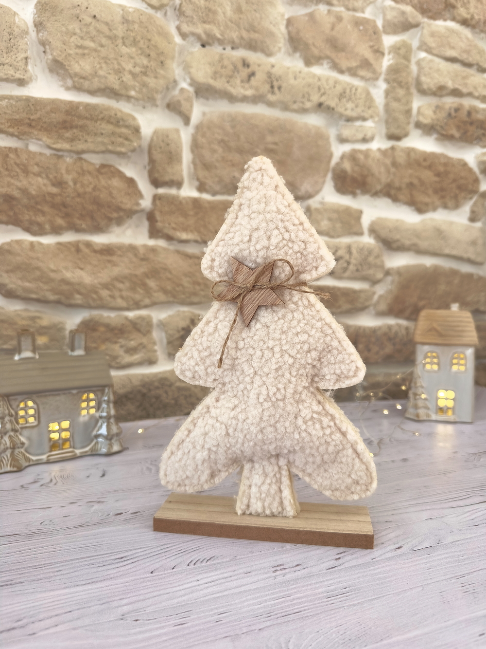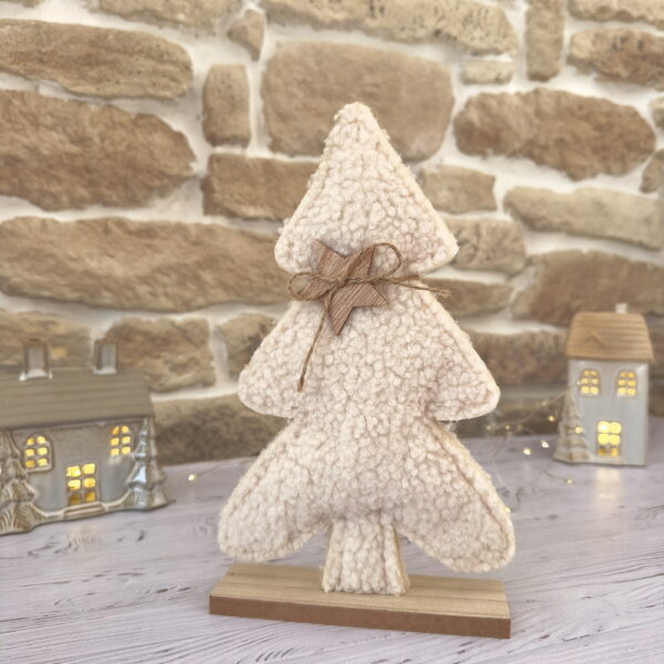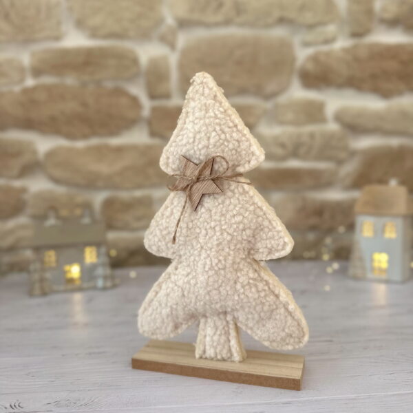 Apportez une touche cocooning et naturelle à votre décoration hivernale avec le Sapin Cocon d’hiver, une pièce à la fois chaleureuse et élégante. Réalisé en tissu effet sherpa blanc crème, ce sapin repose sur un socle en bois brut et est délicatement orné d’une petite étoile en bois suspendue par un fil naturel.