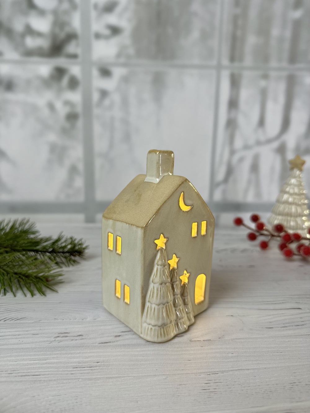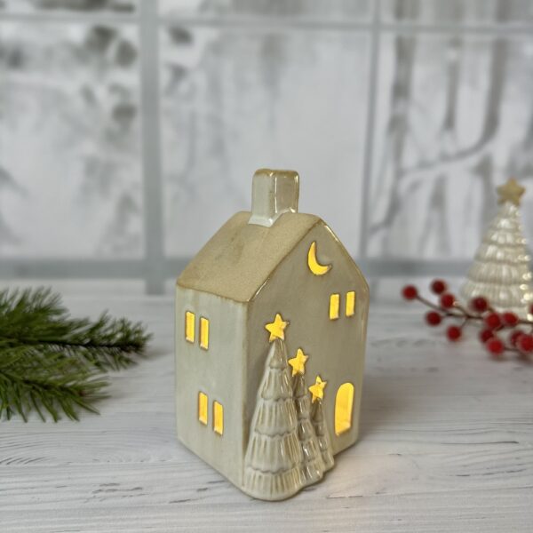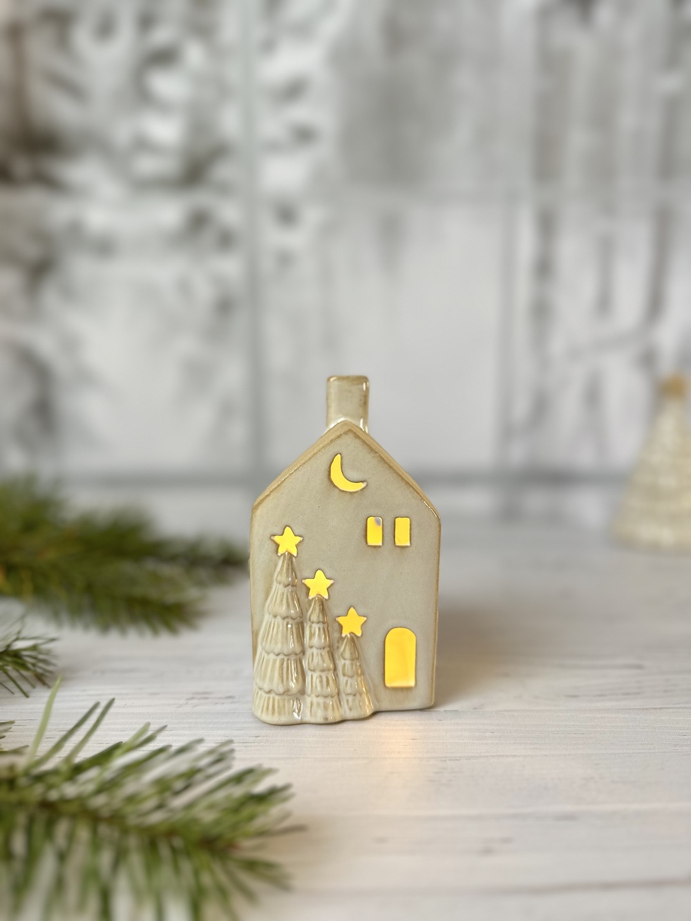 Faites entrer la magie de Noël dans votre intérieur avec la Maison des sapins, une décoration lumineuse en céramique blanche à l’élégance délicate. Ornée de sapins 3D dorés et de découpes fines, elle diffuse une lumière douce et apaisante grâce à son éclairage LED intégré.