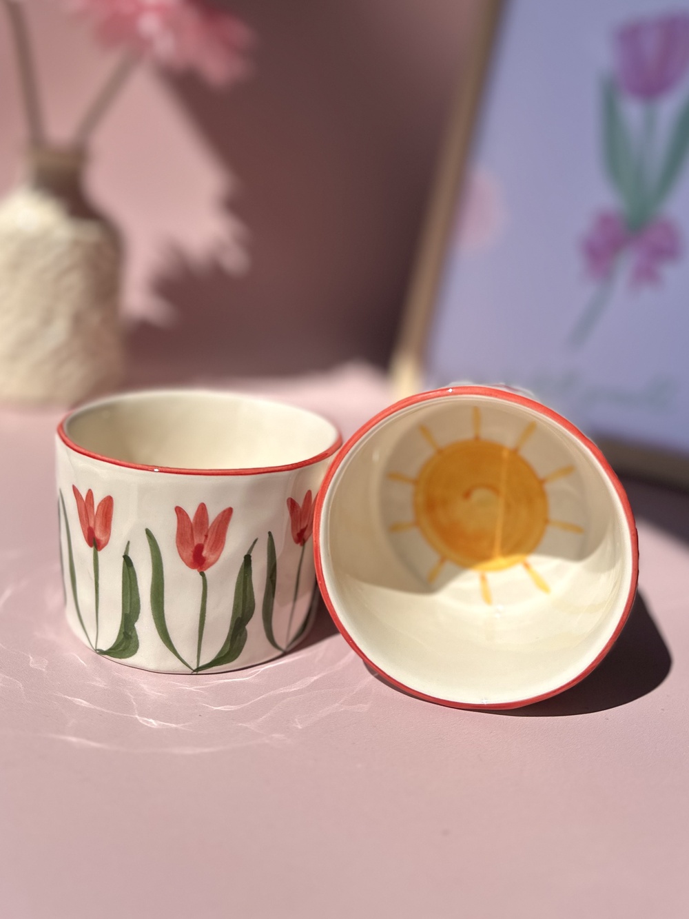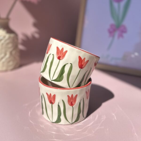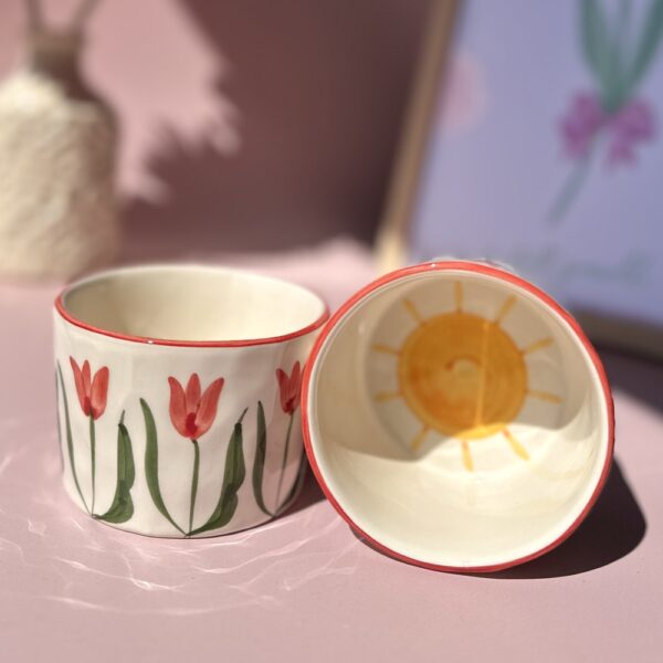 Commencez la journée avec une dose de bonne humeur grâce au mug « Soleil Matin ». Cette céramique artisanale, fabriquée et peinte à la main au Portugal, se distingue par ses motifs de tulipes rouges et vertes peints tout autour, qui apportent fraîcheur et couleur à votre pause café. Au fond, un soleil jaune éclatant illumine chaque gorgée et donne une touche joyeuse à vos matinées. Avec son format pratique de 9 x 6 cm, il est parfait pour savourer un cappuccino crémeux, un thé parfumé ou un café allongé. Plus qu’un simple mug, c’est un accessoire déco qui met du style dans votre cuisine.