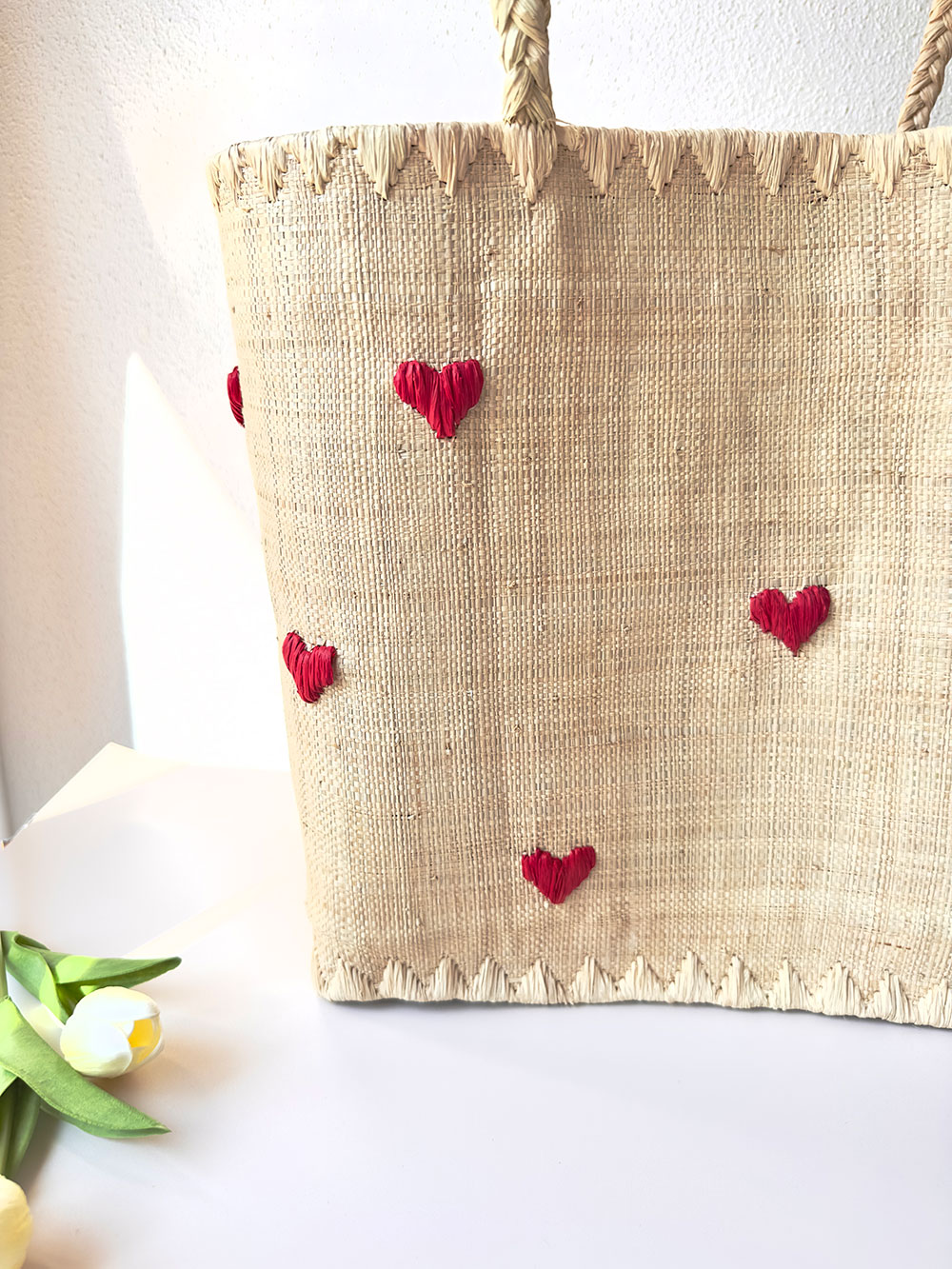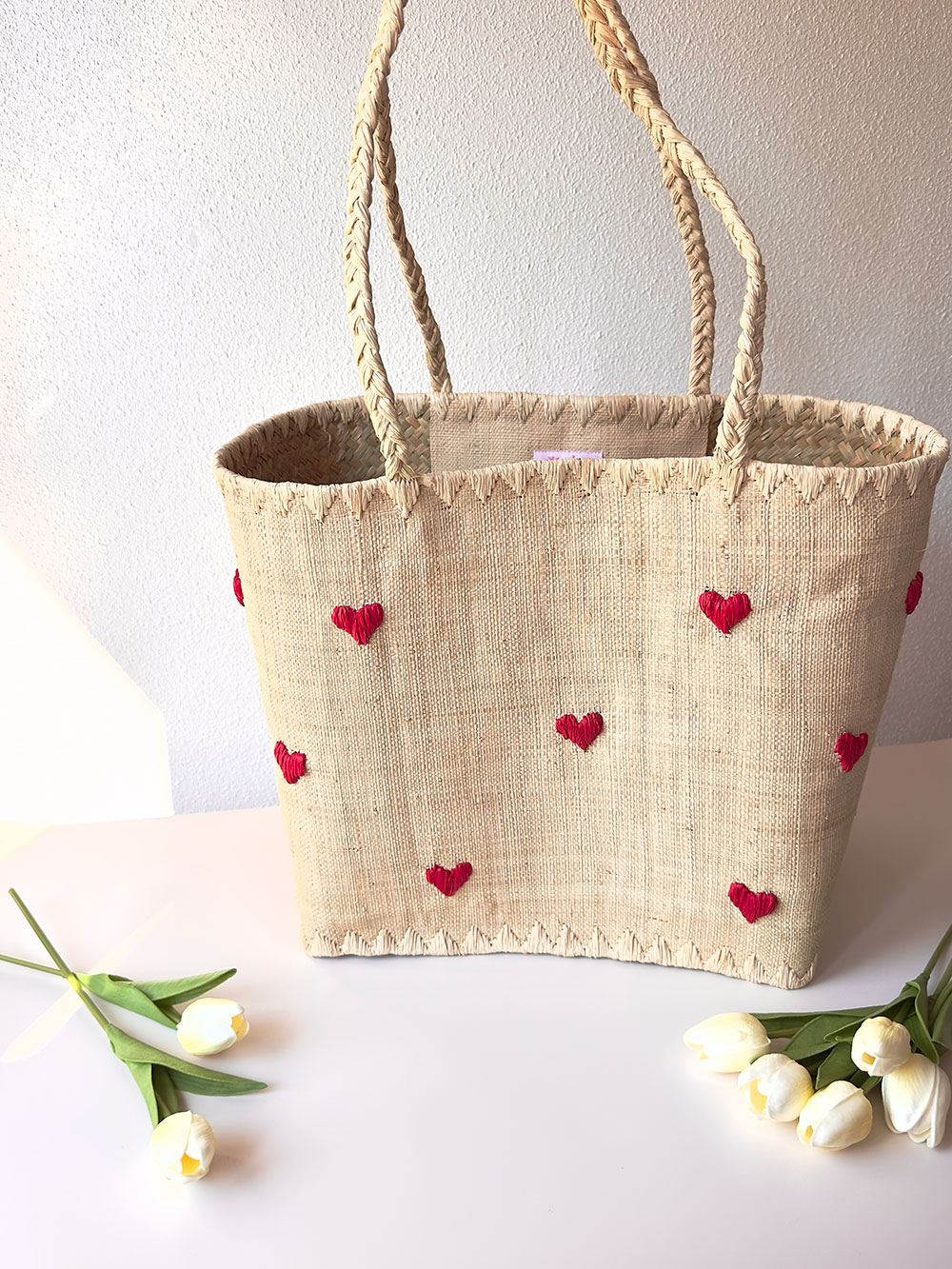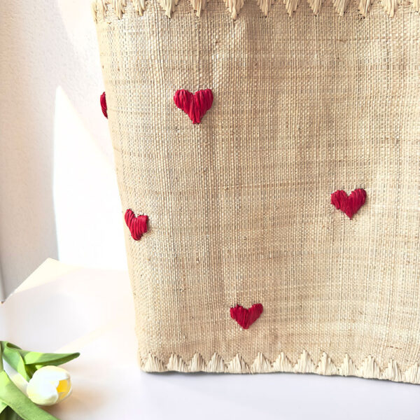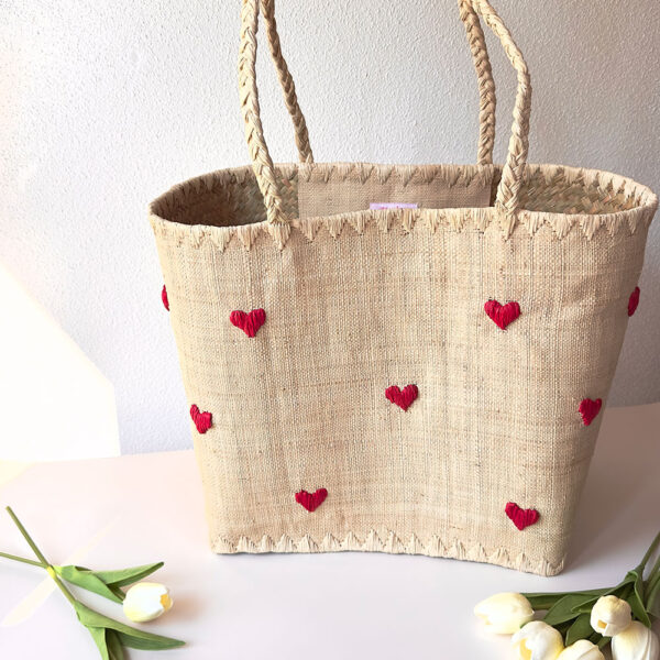 Avec ses jolis cœurs rouges brodés et ses poignées tressées, ce panier en raphia naturel est bien plus qu’un accessoire : c’est un compagnon stylé, plein de charme et prêt à vous suivre dans toutes vos virées.